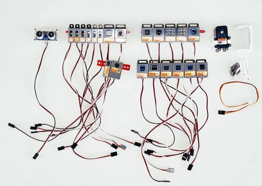 Светодиодные модули трех цветов- имеют полупроводниковый элемент, создающий оптическое излучение при пропускании через него электрического тока, чтобы обеспечивать индикацию о совершенном событии либо его отсутствии. Подключается к блоку управления через соединительный провод, имеет специальный корпус для возможности крепления с деталями конструктора .
